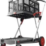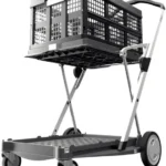 The consists of aluminium and high-quality synthetics. Just by pushing a single button it can be folded or unfolded within seconds. Folded up, it can be easily carried or stored away in a practical manner. As the upper loading area is approx. 130° foldable upwards, it allows for the transport of higher goods on the lower level.