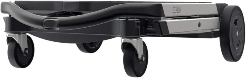 Securing straps are attached to secure the collapsible box. Accidental rolling away is prevented by activating the parking brake. Transport via stairs is made possible by its freestanding wheels. The wheels can be removed with a few easy steps, and stored in the base platform to save space.