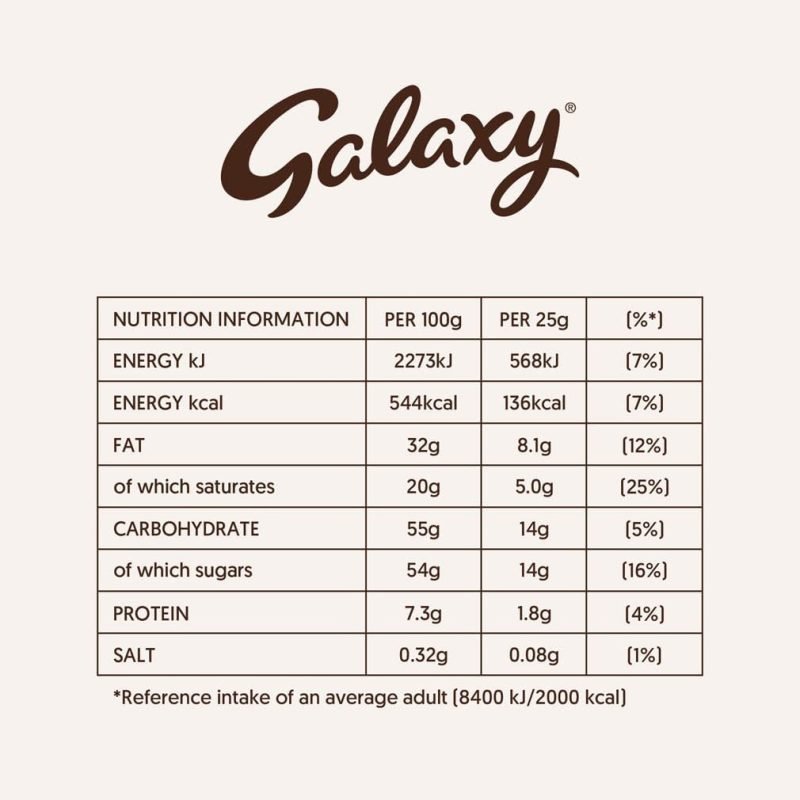 • 1 x 360g Galaxy Smooth Milk Chocolate Bar. Suitable for vegetarians and certified by Rainforest Alliance.